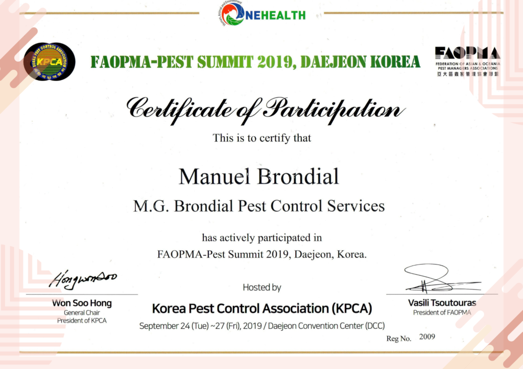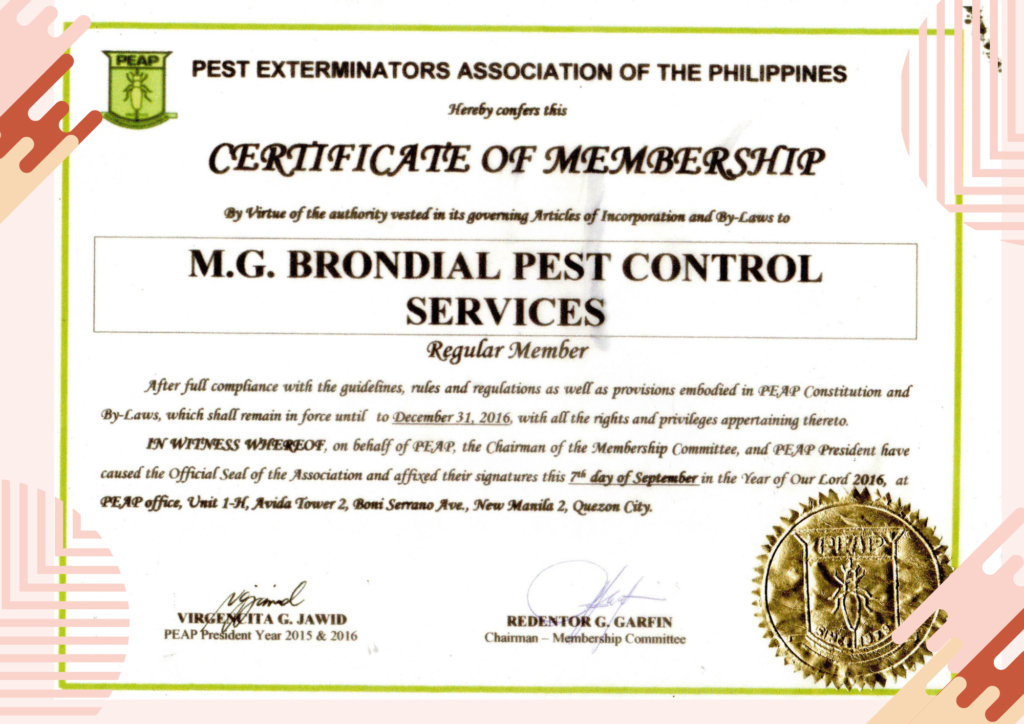 M.G.Brondial Pest Control is committed in providing the best our company can offer, by adhering to high standard of business ethics and of fair competition.